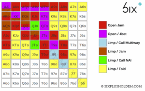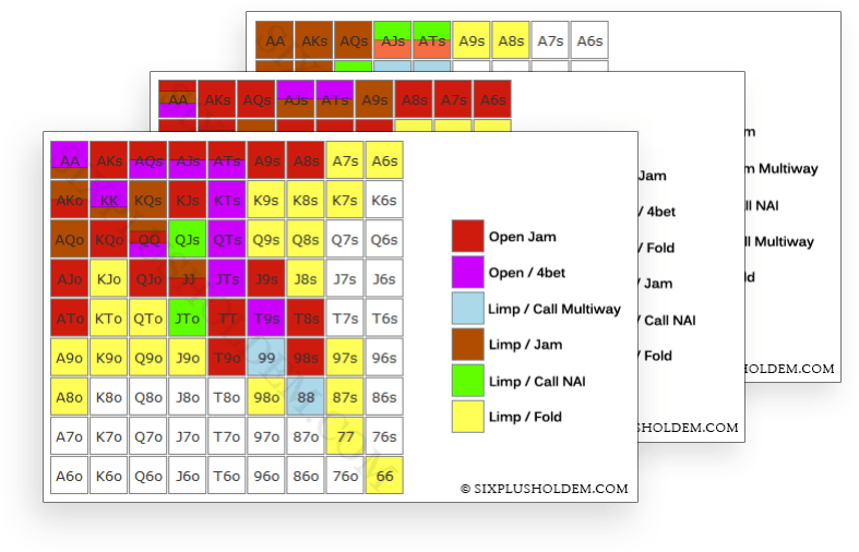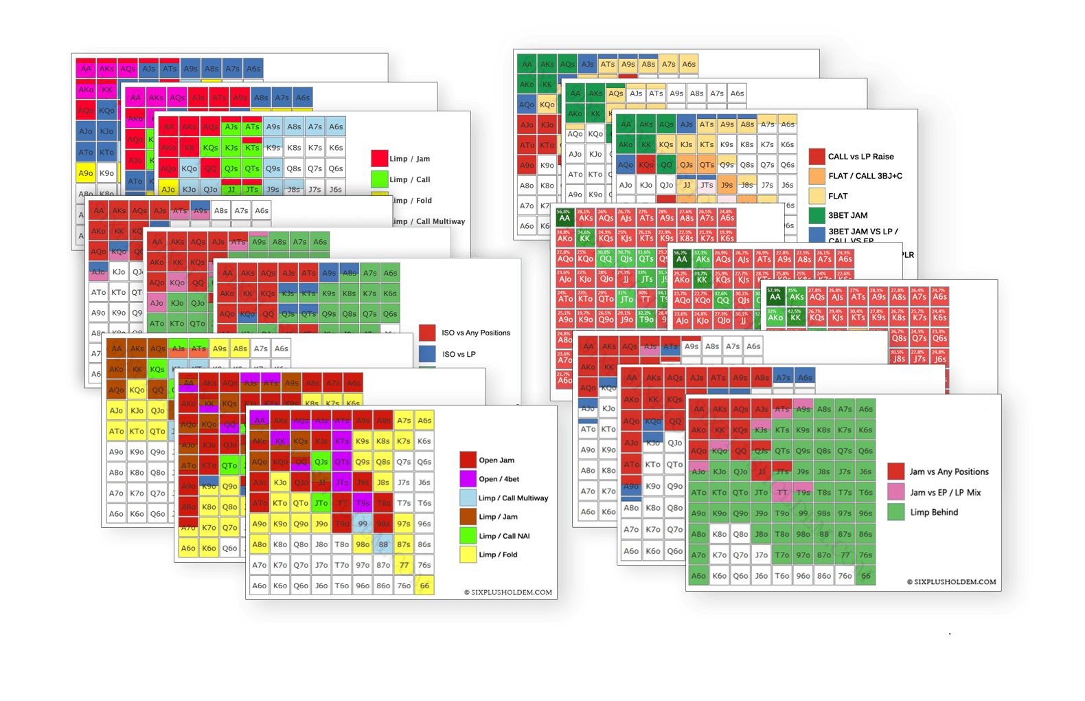 - 6 page guide with valuable strategy content (position play, limping, jamming ranges with hand examples, etc) as well as a thorough walk through on how to read the chart and understand the legend