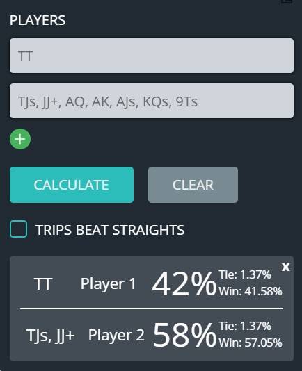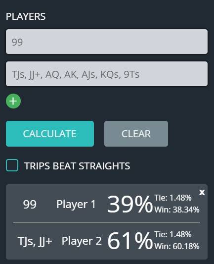 Hands from pocket 6s to pocket 10s are the ones in question and many people tend to overplay those, mostly by calling a large isolation raise out of position. Other common mistakes are raising those first in or against limpers. Unlike in regular NLHE, we barely ever flop an overpair and even if we do so, we are not a big equity favorite against the majority of villains calling range. This being said, pocket pairs are played to flop a set which is going to happen roughly 17% of the time, compared to 12% in no-limit hold’em.