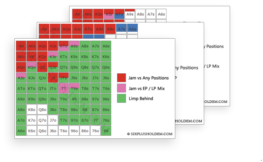 В этой части чартов, освещен очень важный аспект игры, а именно исо-рейз против лимпов. В случаях с изолированием лимперов крайне важно знать диапазоны, так как подобные случаи регулярны в 6+ холдеме.