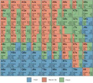 Этот пример лишь показывает формат чартов. Руки окрашены в цвет в соответствии с их частотами. Точные частоты указаны для каждой стартовой руки.
